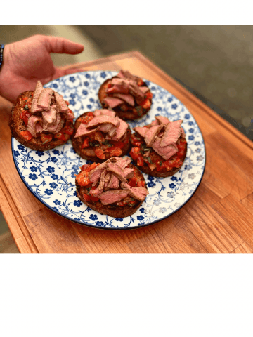 Hotový steak necháme pár minut odpočinout na prkénku. Mezitím si na opečený chleba/bagetu nandáme rajčatovou směs. Steak poté nakrájíme na tenké plátky a dozdobíme jím bruschettu.