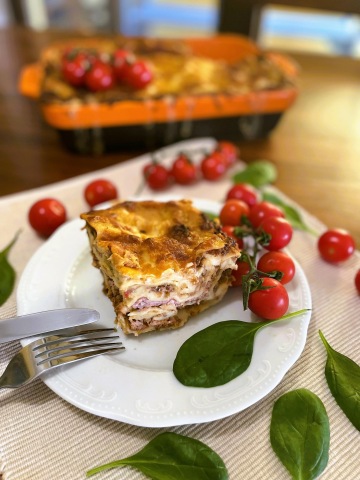 Nejdříve si připravíme masové ragú jako na boloňskou omáčku (tj. cibule, česnek, mrkev, řapíkatý celer, rajčata, rajčatové pyré, mleté hovězí, sklenka červeného vína, sůl a bazalka). Rovněž si připravme bešamel (tj. rozpustíme máslo, zapražíme hladkou moukou a postupně přidáváme ohřáté mléko, vše pečlivě zamícháme/rozšleháme a krátce povaříme, dochutíme solí). Vezmeme si větší zapékací mísu a začneme vrstvit v tomto pořadí: bešamel, těstovina, bešamel, masové ragú – takto uděláme několik vrstev dle velikosti mísy,  na masové ragú můžete dle vaší preference přidávat např. šunku, ale i žampiony, rajčata a špenát, vrstvy zakončíme bešamelem a posypeme mozzarellou. Dáme zapéct do rozehřáté trouby na 160 stupňů na cca 45 minut. Po upečení necháme lasagne několik minut odpočinout, dozdobíme rajčaty a můžeme podávat.
