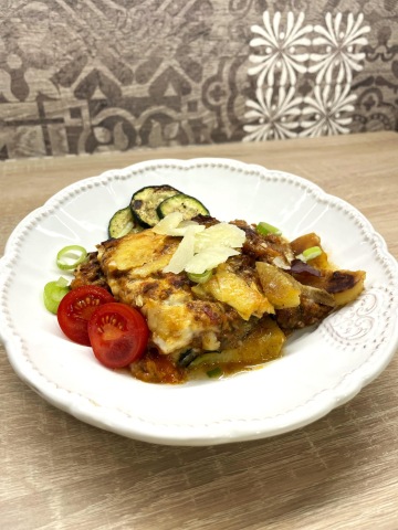Když máme přípravu ingrediencí dokončenou, vezmeme si zapékací mísu a začneme vrstvit v tomto pořadí: bešamel, brambory, lilek, cuketa, rajčata, masové ragú, bešamel a posypeme nastrouhaným sýrem – ideální je parmazán.