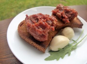 Maso ochutíme sami, tj. přidáme kečup, hořčici, worcester, cibuli, okurku, mletou papriku, sůl a pepř a nandáme na topinky potřené česnekem. Pamatujte, že topinky s česnekem mají samy o sobě hodně výraznou chuť, takže i tatarák by měl být výrazný, aby se jeho chuť na topince neztrácela.